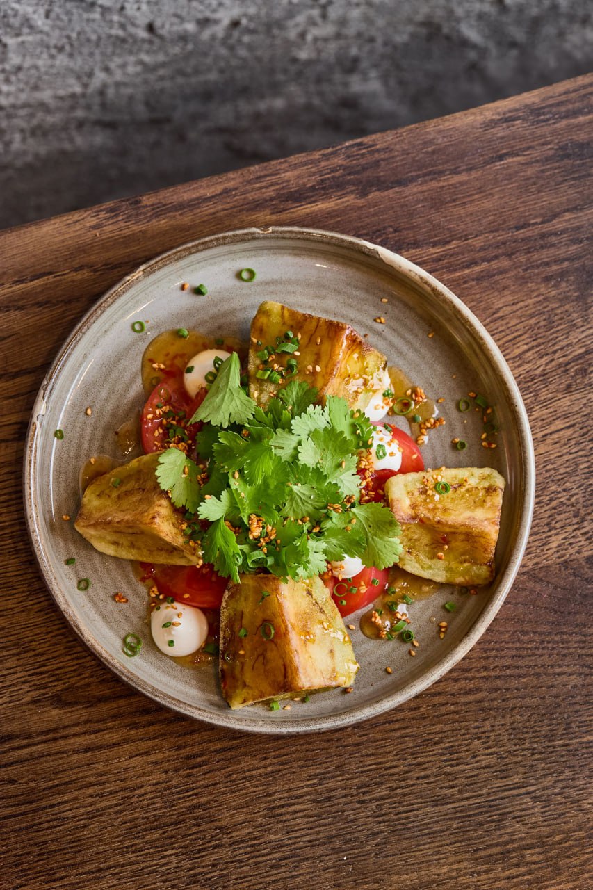 crispy eggplant, mixed tomatoes, feta mousse, green onions, cilantro, spicy…