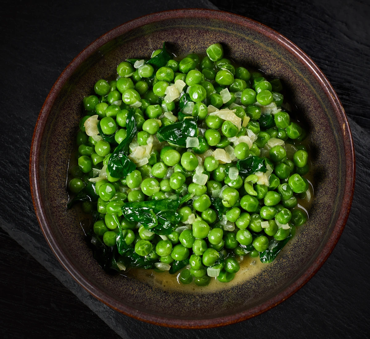 Green peas, green beans, baby spinach, onion, butter, chicken stock