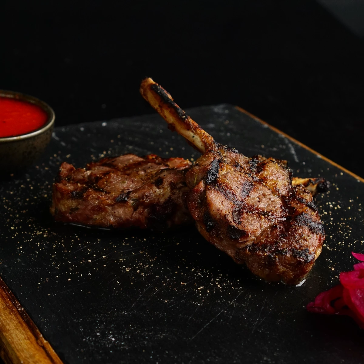 Каре телятини, лаваш, домашня аджика, маринована кримська цибуля. Орієнтовна вага…