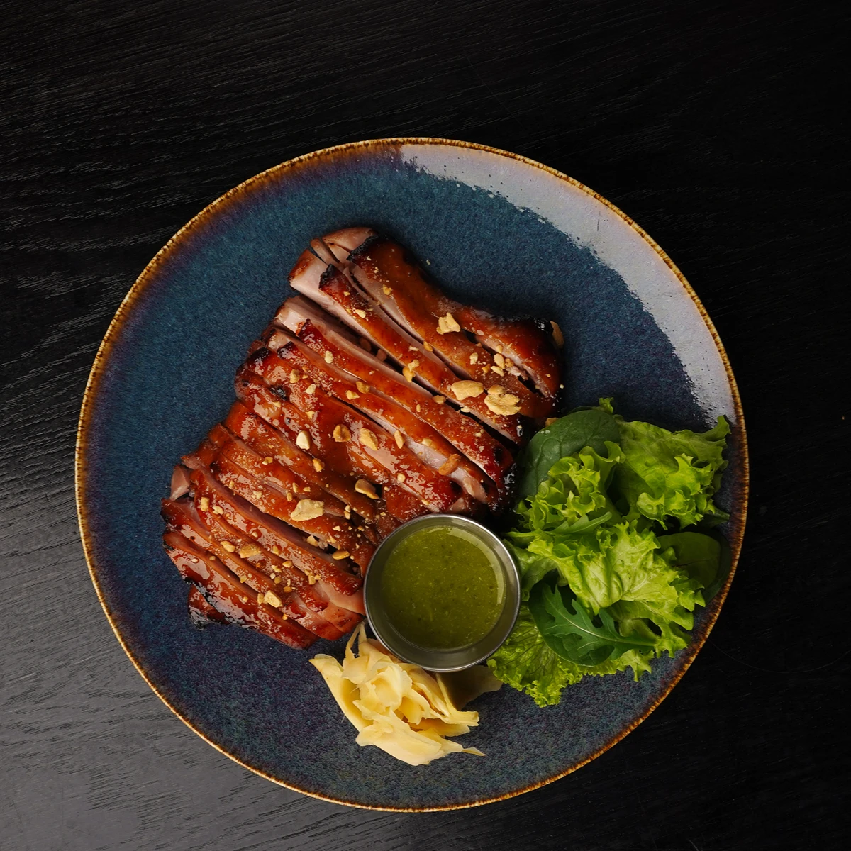 Куряче стегно (мариноване в соусі Чар Сіу), фундук , мікс…