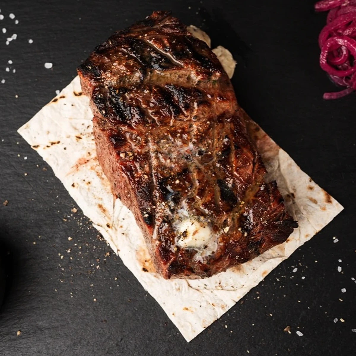 Яловича вирізка, лаваш, масло із зеленню, цибуля кримська маринована, аджика.…