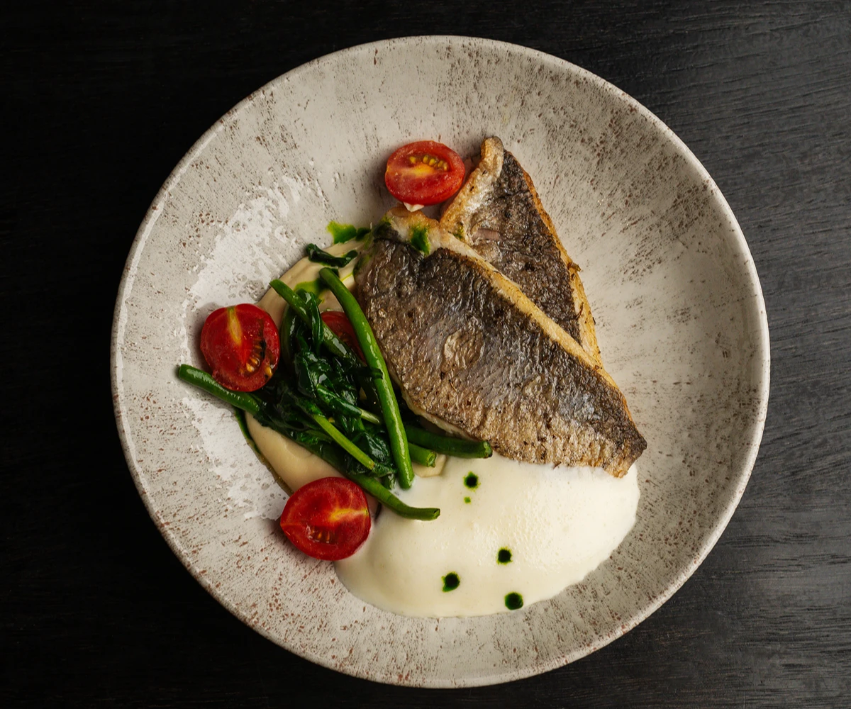 Філе лосося, соус Берблан, соус В’єрж, мариновані цукіні, маш-салат, фундук,…