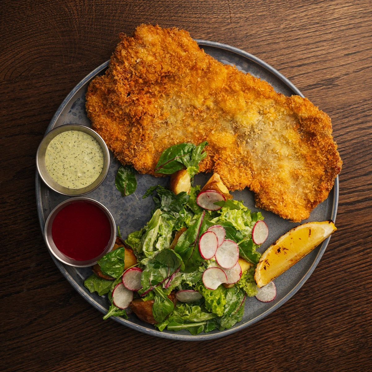 Шніцель з телятини, соус з журавлини та мʼятно-базиліковий, лимон, мікс…