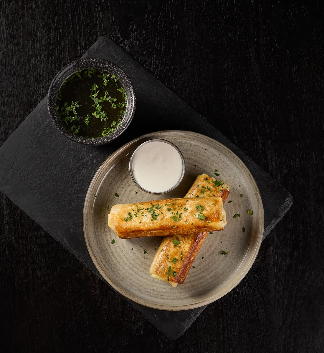 Два млинці (курячо – свинний фарш, морква, цибуля), сметана, курячий…