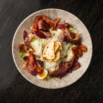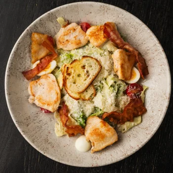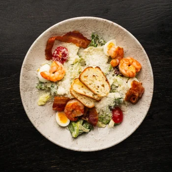 Мікс салату, помідори чері, перепелині яйця, бекон, пармезан, соус Цезар