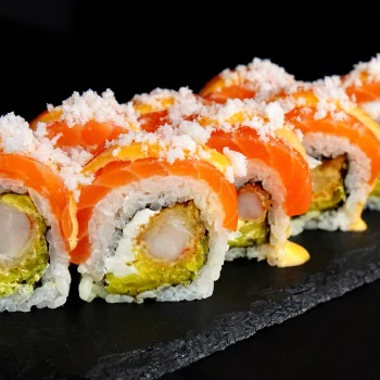 Лосось, креветка темпура, крем-сир, дайкон (японська редька), пікантний соус на основі sweet chili, шрірачі та айолі, крихти з рисових чіпсів.