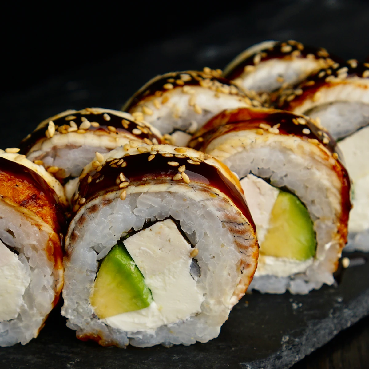 вугор, сир філадельфія, авокадо, сир тофу, соус унагі, кунжут