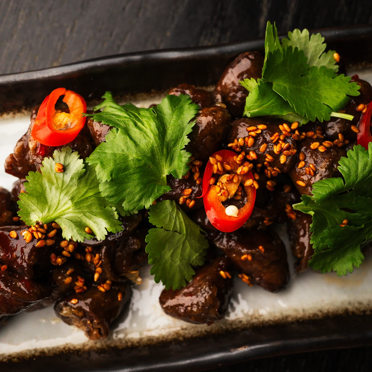 Курячі серця у темпурі, кінза, соус Sweet chili,, гострий кунжут, перець чилі.