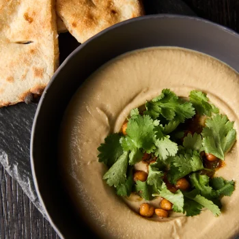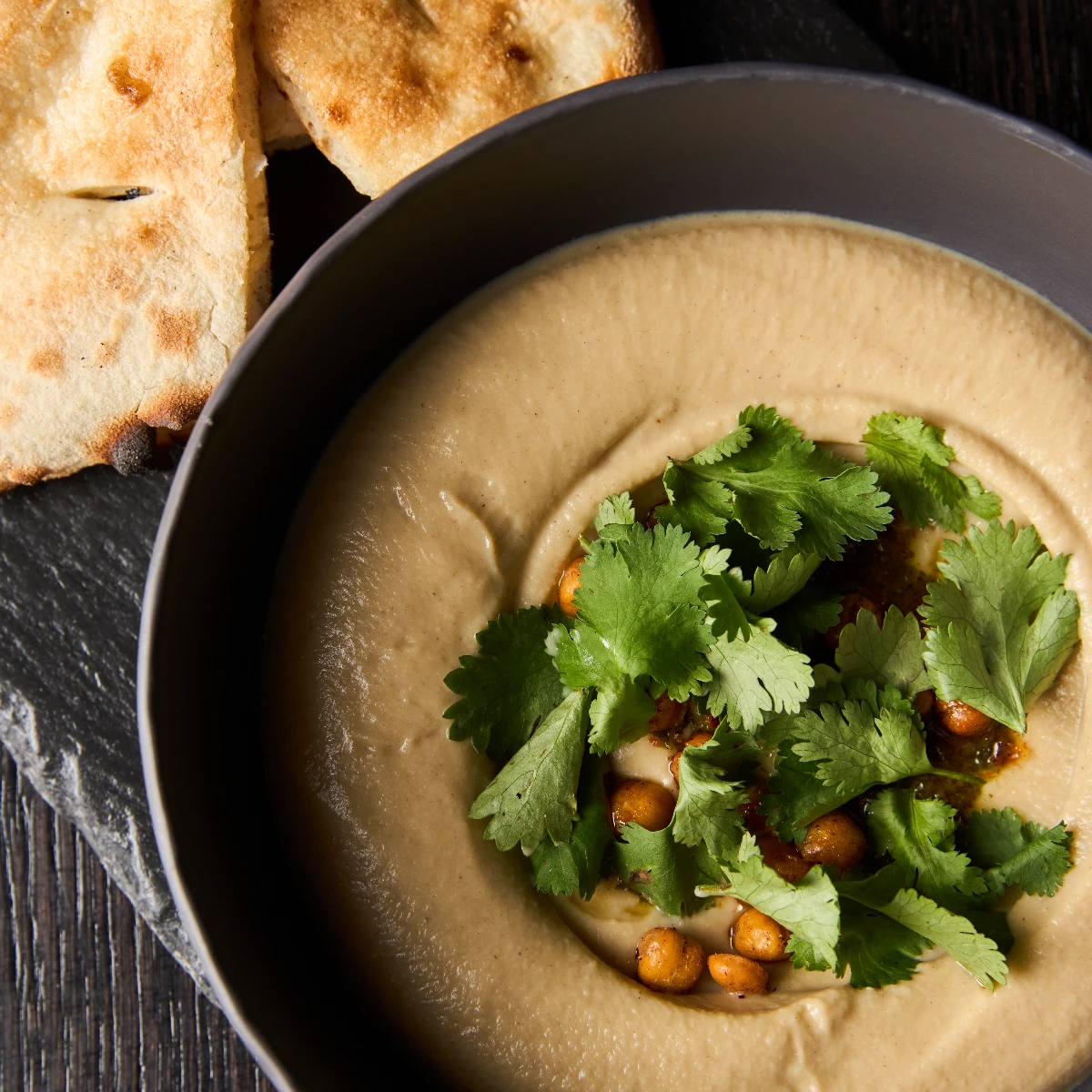 Паста з нуту, оливкова олія з чімічурі, кінза. Подаємо з фокачею