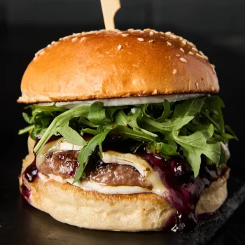 Яловича котлета, сир брі, дор блю, чорничне конфі, соус Aglio Olio, рукола.