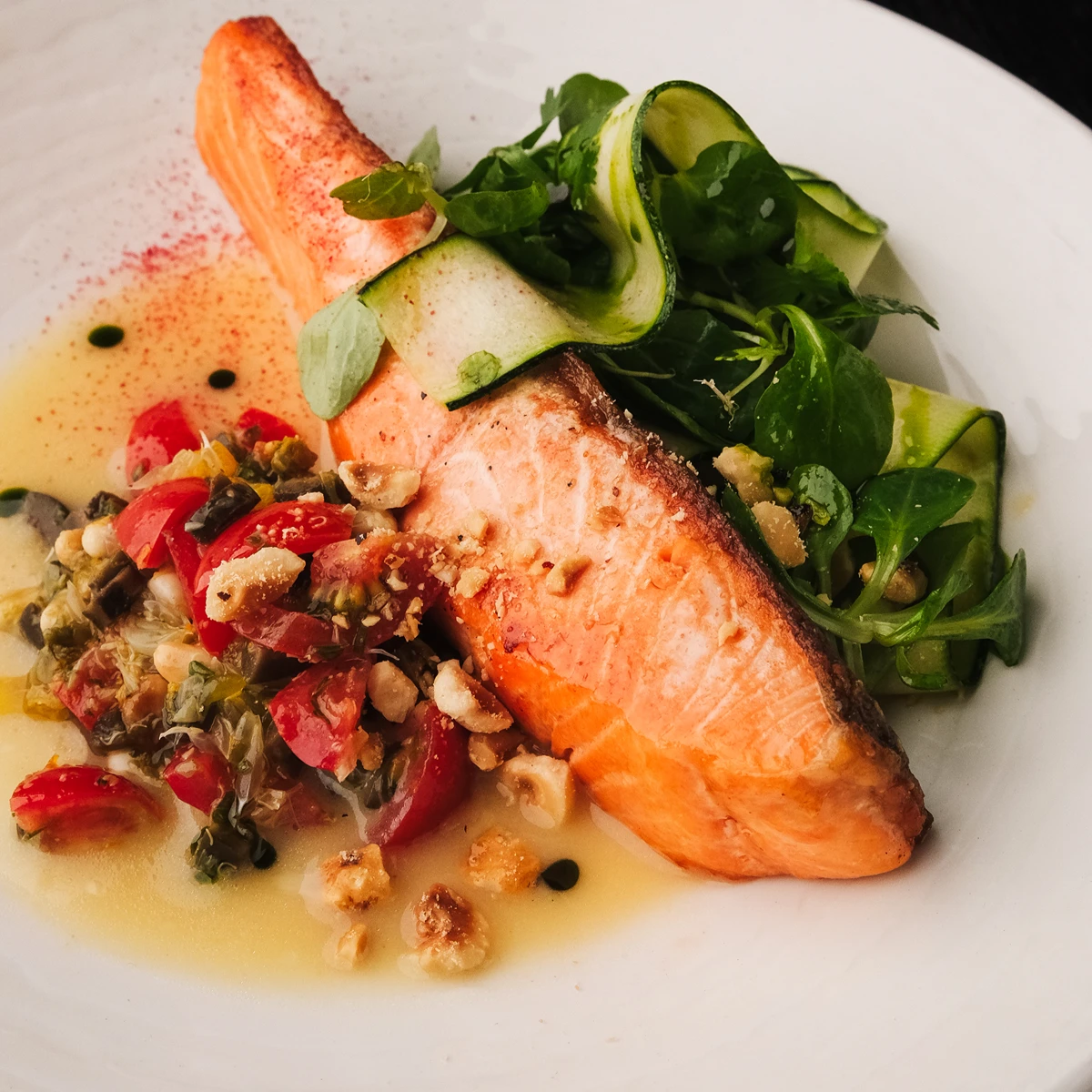 Філе лосося, соус Берблан, соус В’єрж, мариновані цукіні, маш-салат, фундук, зелена олія.