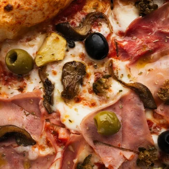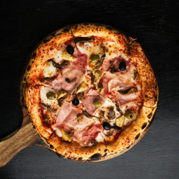 Томатна основа, прошутто котто, печериці, моцарелла, маслини, оливки, артишоки, каперси, орегано.
