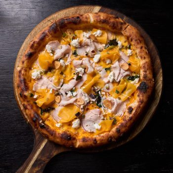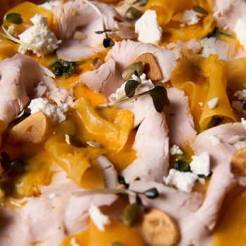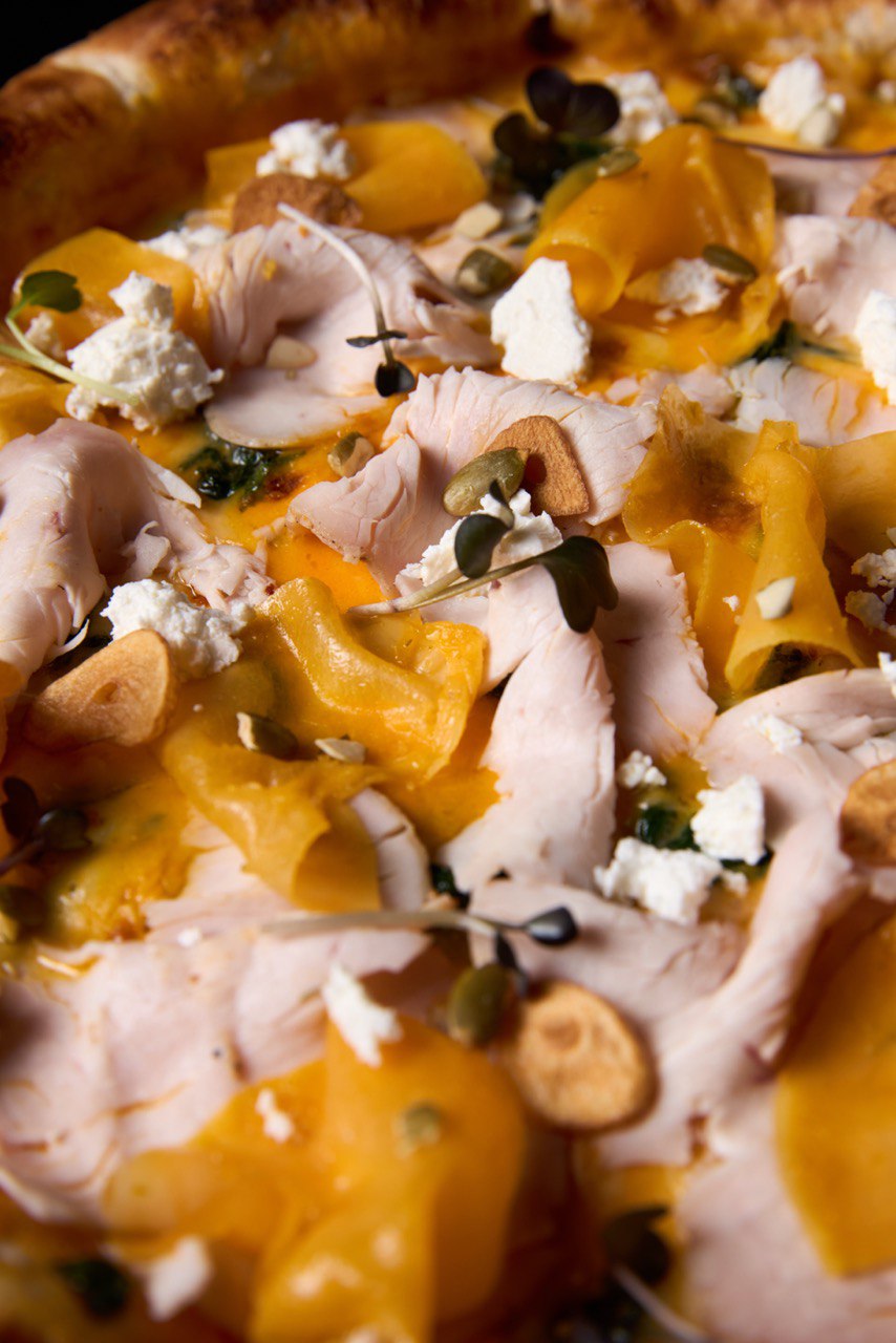 Гарбузова основа, бланширований шпинат, моцарелла, пастрамі з індички, фета, маринований гарбуз, чіпси часнику, гарбузове насіння