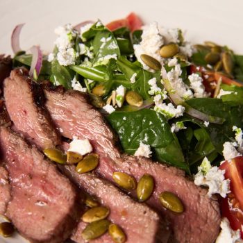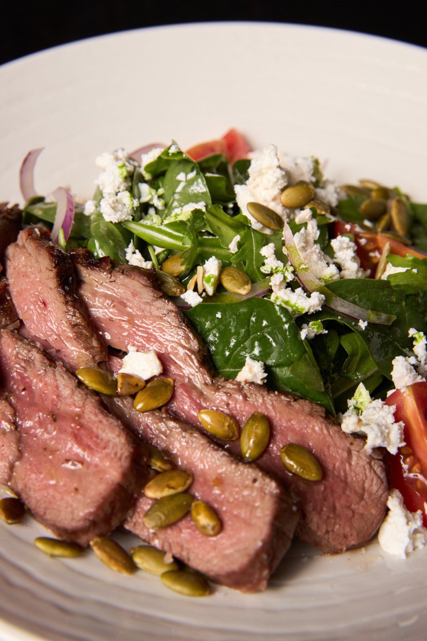 Гарбузовий крем з кунжутною пастою, чері, кримська цибуля, рукола, бейбі шпинат, кедрова закравка на основі кунжуту, кімчі та цитрусових, фета, насіння гарбуза та яловича вирізка просмажки medium