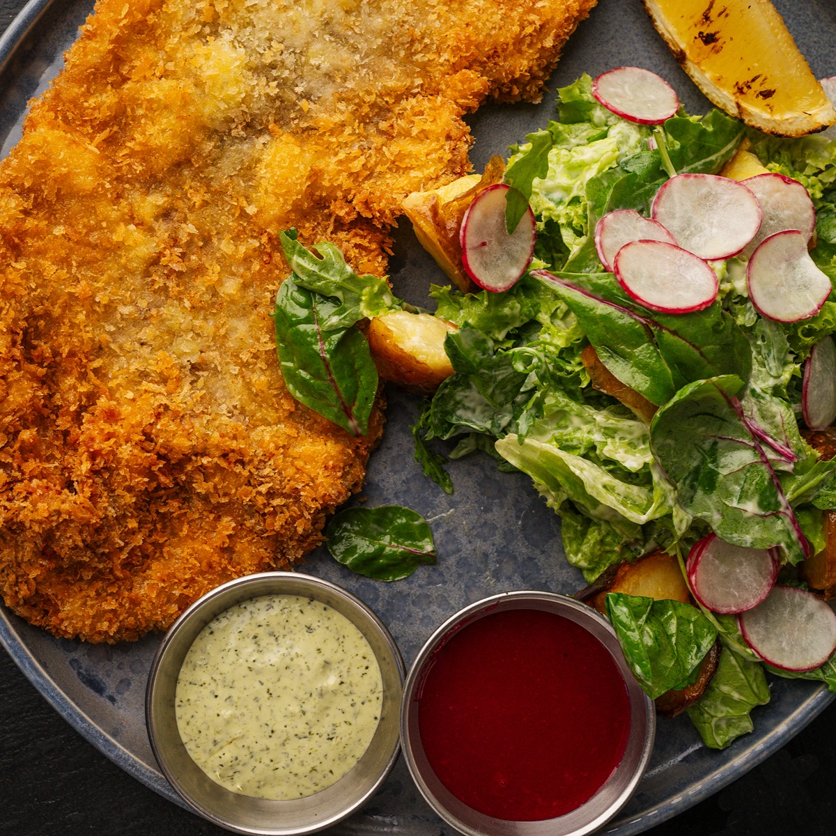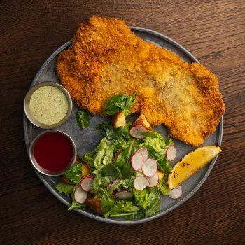 Шніцель з телятини, соус з журавлини та мʼятно-базиліковий, лимон, мікс салату із печеною картоплею, редиска