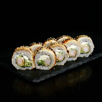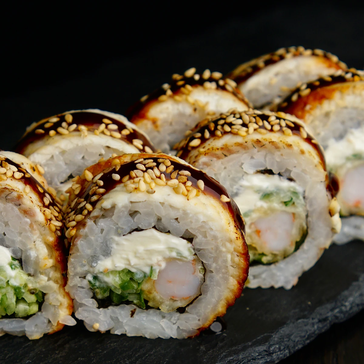 вугор, крем-сир, гострий соус, соус унагі, огірок, креветка темпура, кунжут