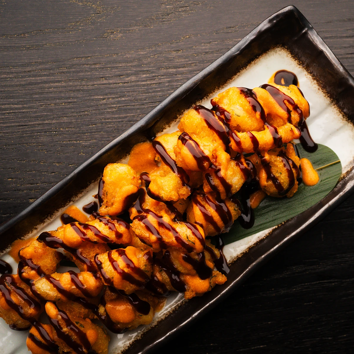 Тигрова креветка в клярі, томатно – вершковий соус, унагі, імбир…