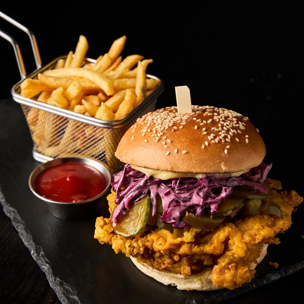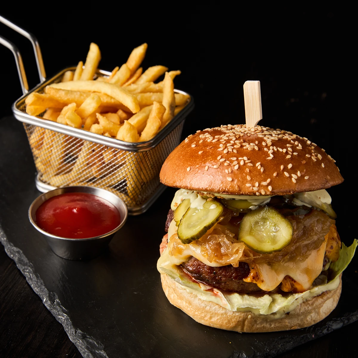 Яловича котлета з ндуєю з хоспера, чедер, моцарела, айсберг, мариновані…