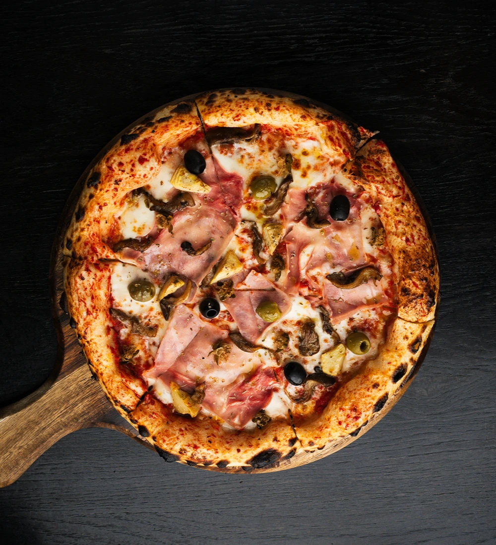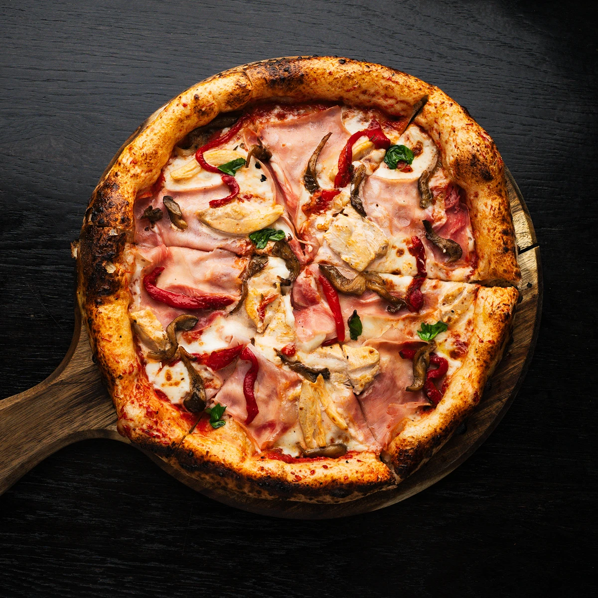 Томатна основа, прошутто котто, печериці, моцарелла, маслини, оливки, артишоки, каперси,…