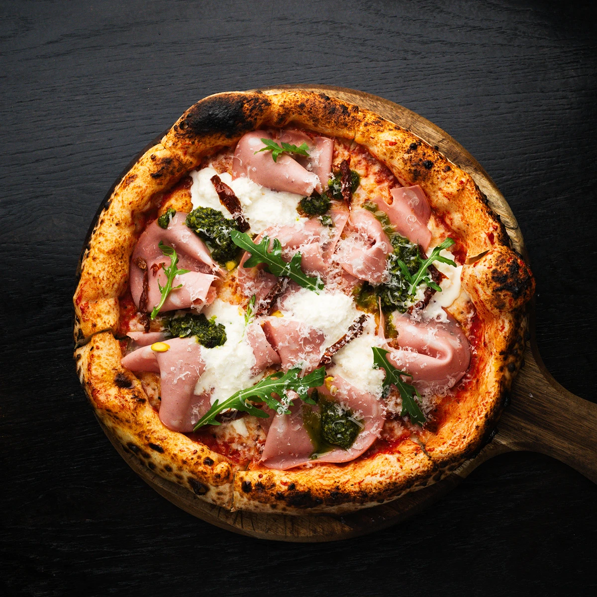 Томатна основа, мортаделла, фісташкове песто, страчателла, моцарелла, вʼялені томати, рукола.